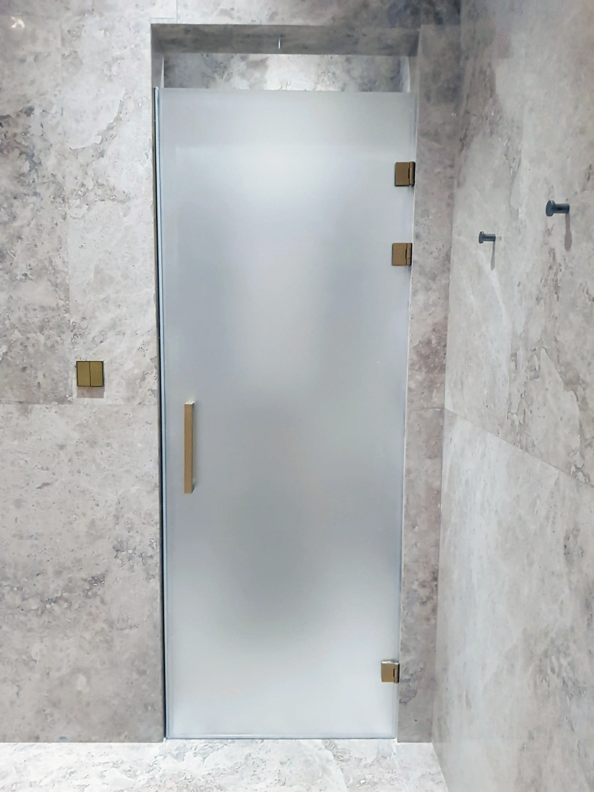 Раздвижные двери из закалённого стекла (слайд-система) — створка движется по направляющим параллельно стене, экономит пространство.