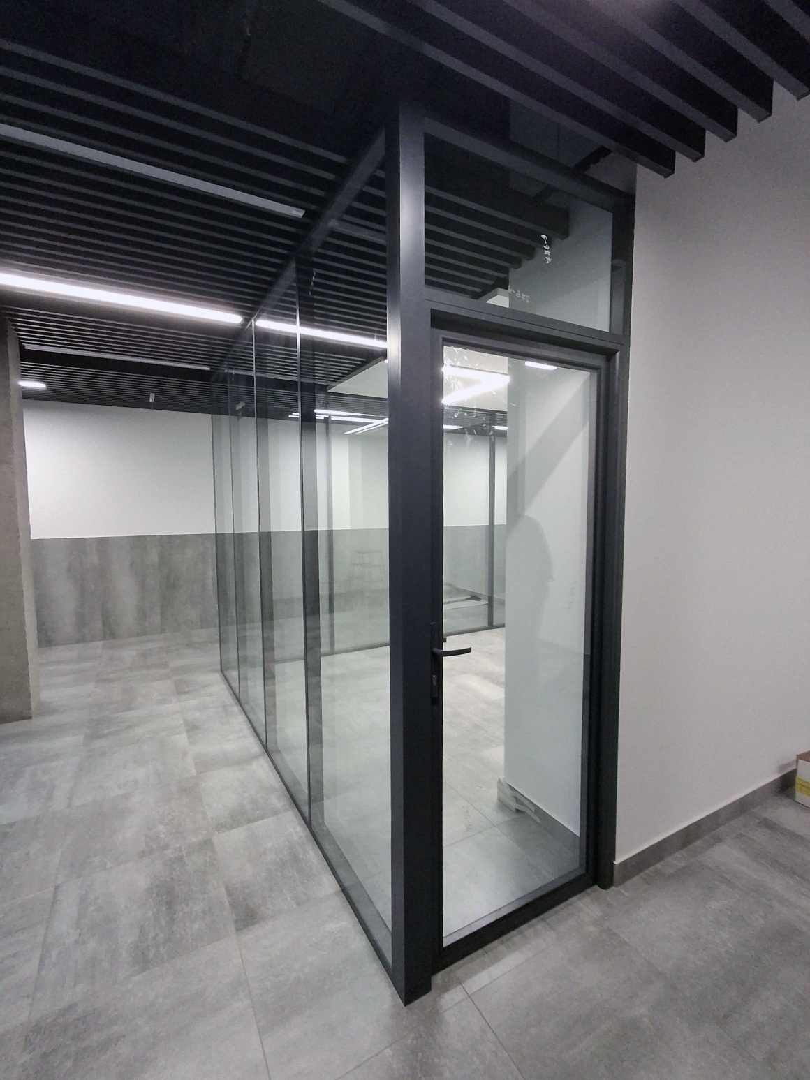 Стеклянная перегородка на узком профиле без вертикальных ригелей с одинарным заполнением