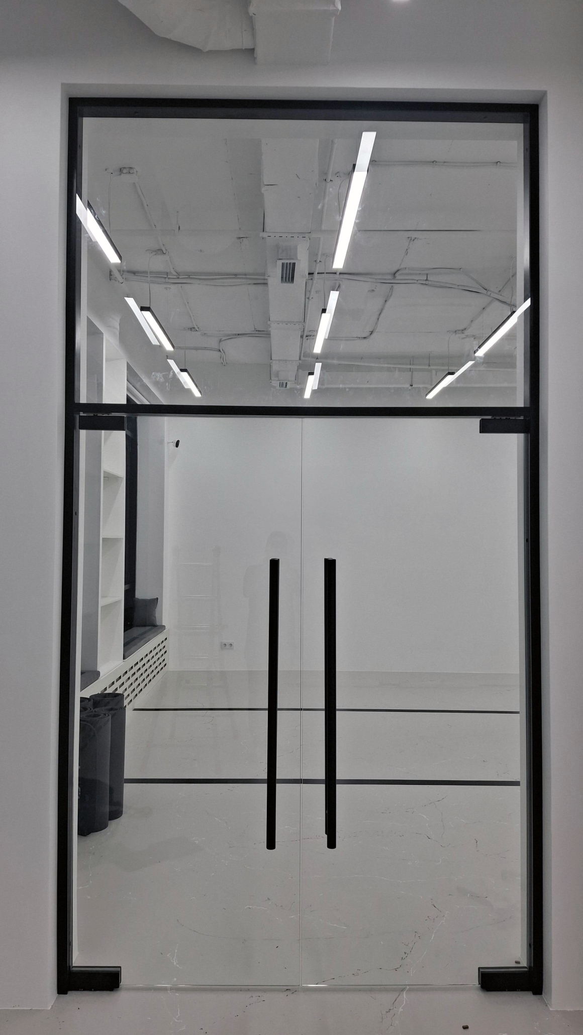 Ключевая особенность — сверхтонкий несущий профиль, который практически незаметен на фоне стекла и подчёркивает «парящий» эффект конструкции